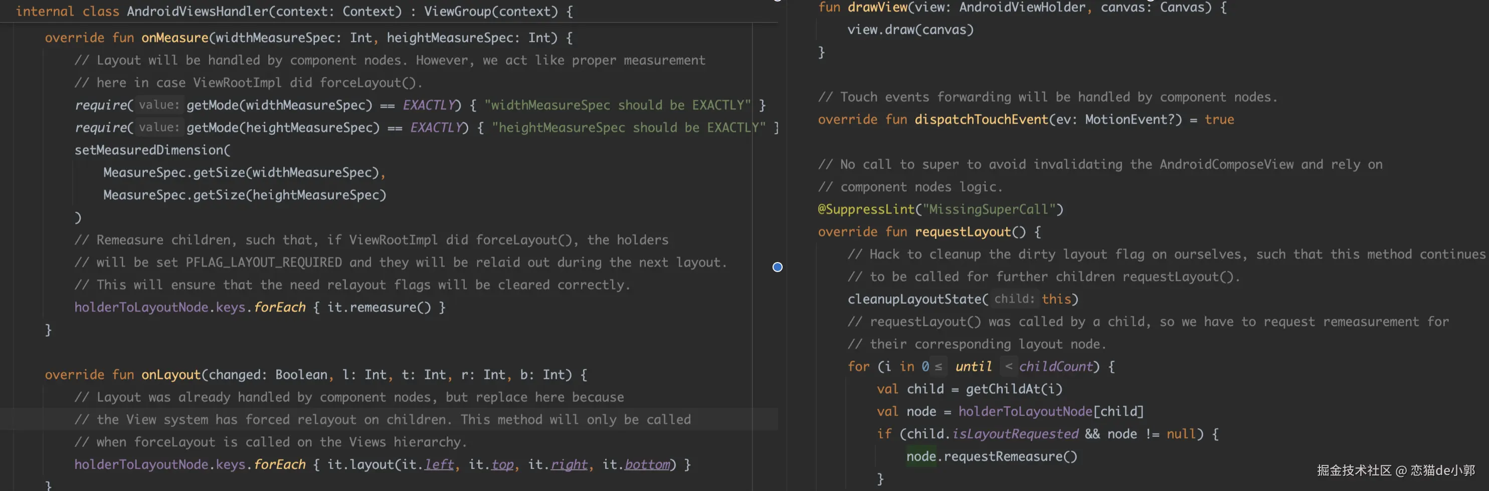 而 Android 上 ViewFactoryHolder 的实现主要在它基类 AndroidViewHolder ,这里可以看到 AndroidViewHolder 那可是一个“实实在在”的传统 ViewGroup 实现 :