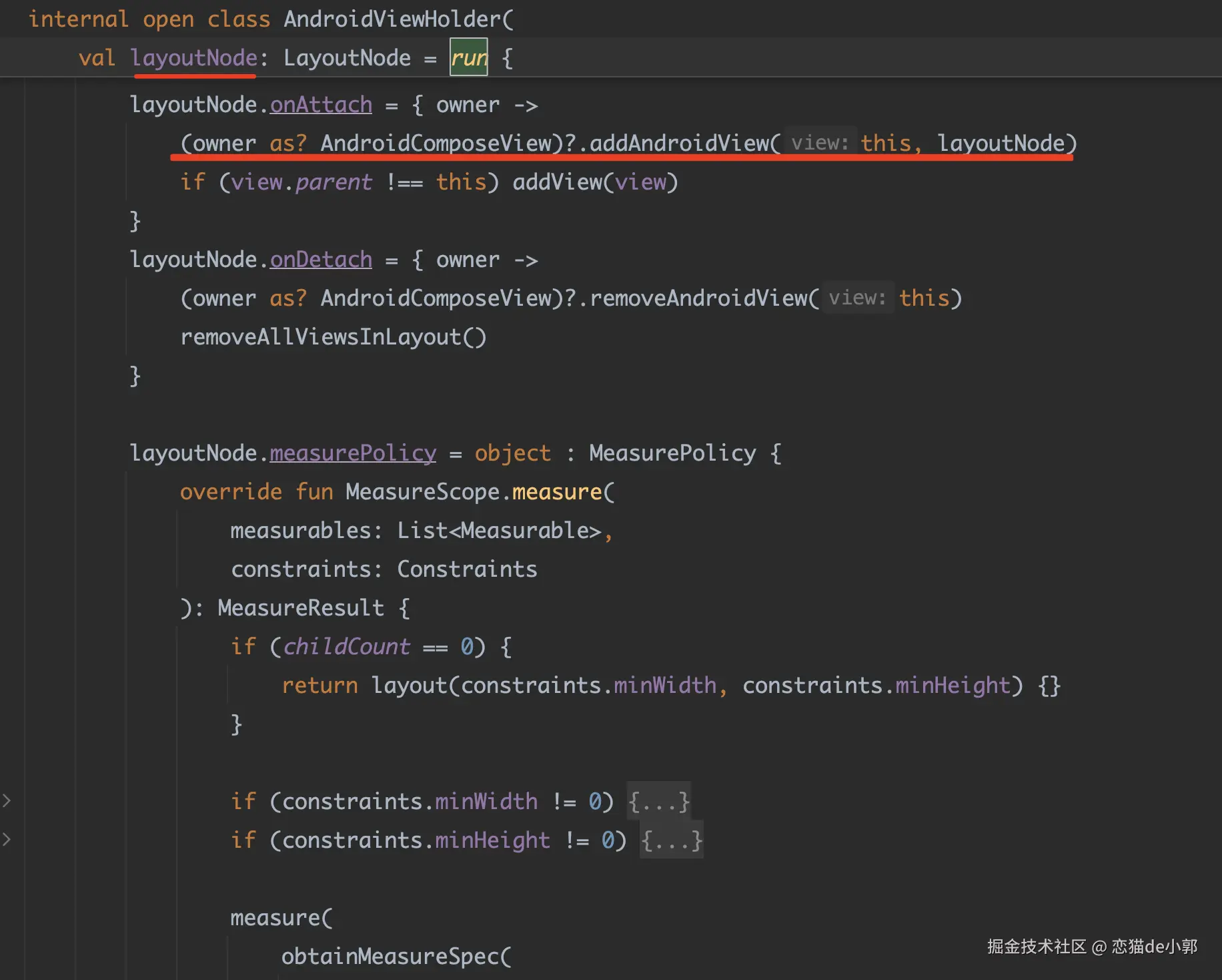 带着这两个问题,我们继续看,首先我们在 AndroidViewHolder 里可以看到有 layoutNode 的实现,也就是其实这个 Holder ,它既是传统 ViewGroup ,又具备 Compose 里的 layoutNode 实现: