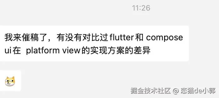 在上一篇《深入 Flutter 和 Compose 在 UI 渲染刷新时 Diff 实现对比》发布之后,收到了大佬的“催稿”,想了解下 Flutter 和 Compose 在 PlatformView 实现上的对比,恰好过去写过不少 Flutter 上对于 PlatformView 的实现,这次恰好可以用来和 Compose 做个简单对比: