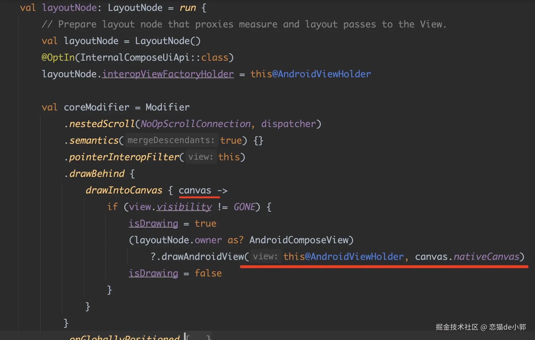 最后就是绘制,知道流程后,我们直接看回 AndroidViewHolder 里的 layoutNode 实现,在这里有一个来自 drawBehind 的 canvas :