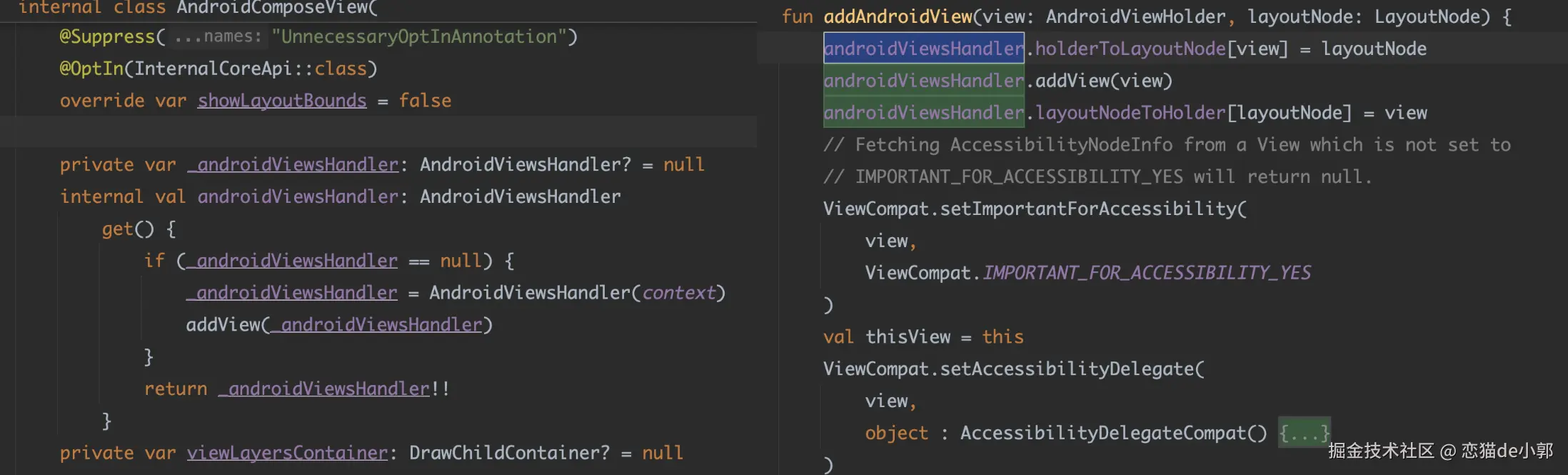 我们看 AndroidComposeView 的源码,可以看到 AndroidComposeView 同样是一个 ViewGroup ,它的内部主要是有一个 AndroidViewsHandler 的 ViewGroup 在处理 AndroidViewHolder ,比如前面的 addAndroidView 就是将 Holder 添加到 Handler :