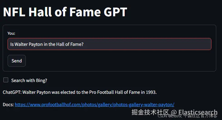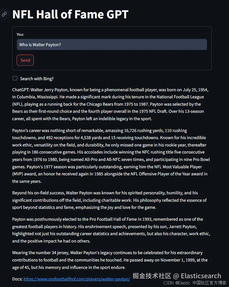 示例查询,以确保 Walter Payton 文档已被提取到索引中。