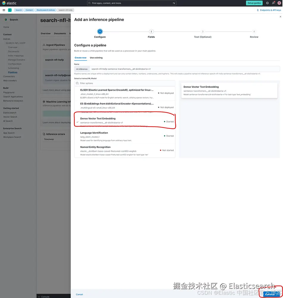 步骤 9:选择密集向量文本嵌入 sentence-transformers__all-distilroberta-v1 然后点击继续