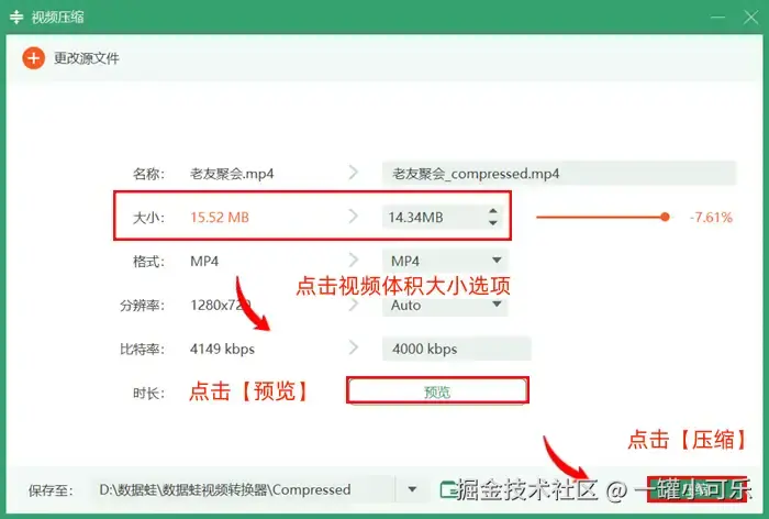 步骤3:点击视频体积大小选项,输入具体的视频体积数值调整视频大小,然后点击【预览】查看压缩效果,确认后点击【压缩】即可。