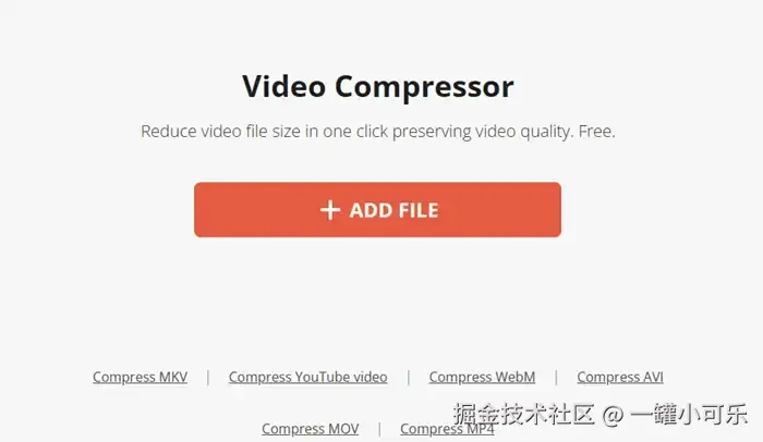 操作步骤: 打开该网站 → 点击【+ADD FILE】导入视频 → 等待其自动压缩完成。