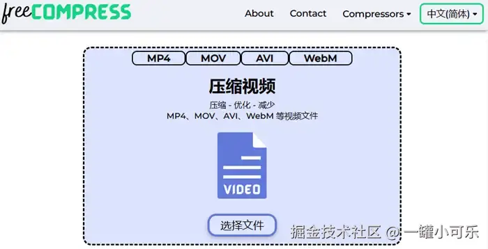 操作步骤: 进入该网站 → 点击【压缩视频】→ 点击【选择文件】导入视频 → 等待压缩完成。