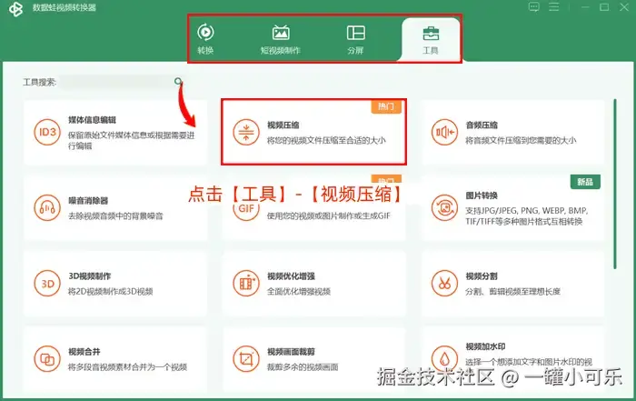 步骤1:将手机视频上传到电脑,打开并进入数据 蛙视频转换器的主页面中,点击【工具】-【视频压缩】。