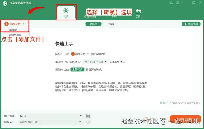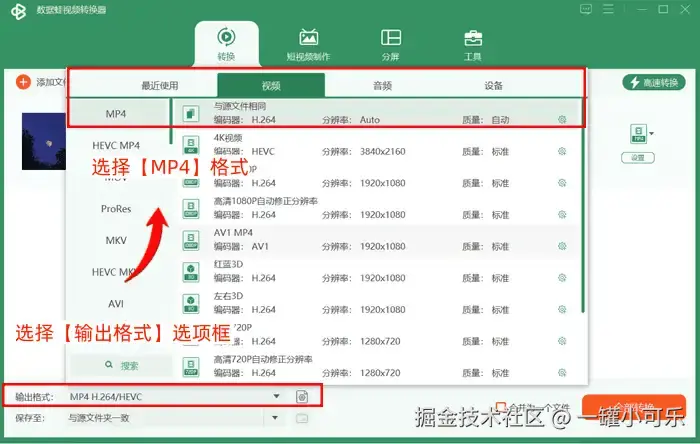 操作步骤: 点击【+视频】 → 选择【转为MP4】格式 → 点击【转换】。