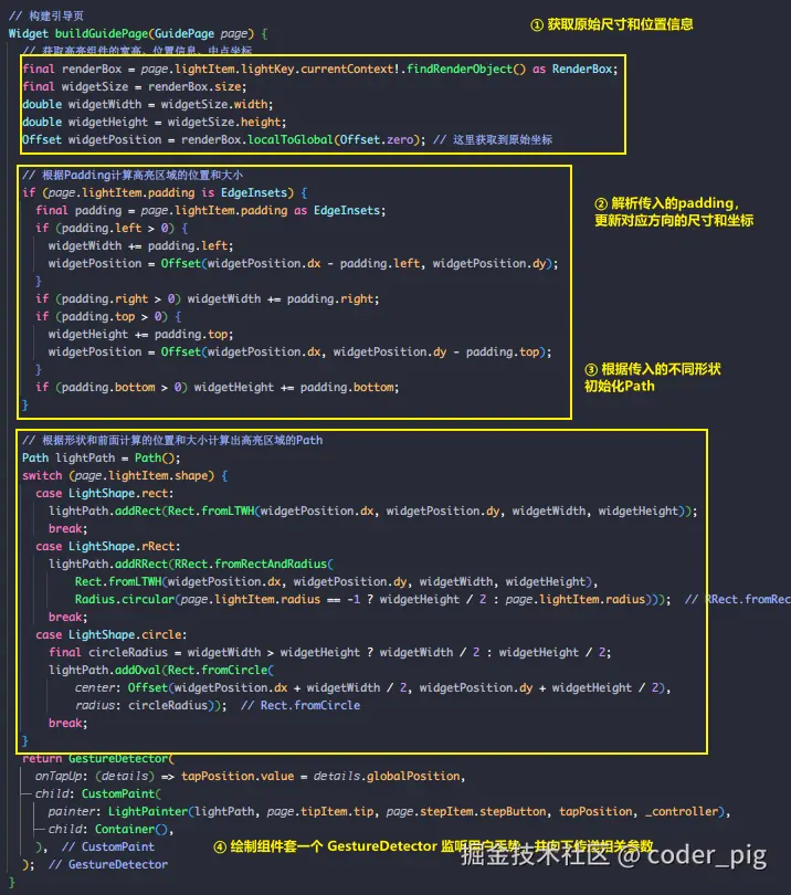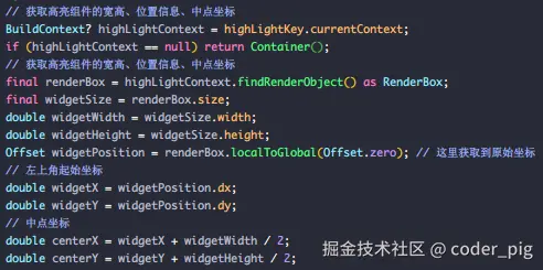 先为 高亮Widget 的 key 属性设置一个 GlobalKey,然后通过它访问Widget的 BuildContext,从而获得 RenderBox,进而获取到 Widget 的 尺寸和位置信息。