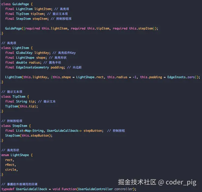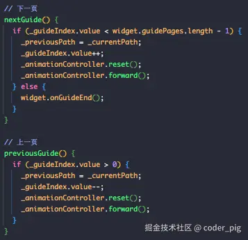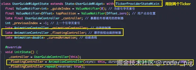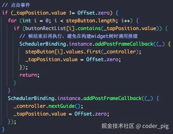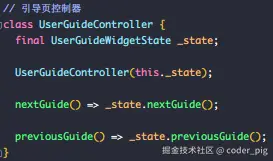除了定义一个 GuidePage 的引导页列表外,还定义了一个 引导结束的回调,毕竟,有时有引导完成执行相关操作的需求 (如弹窗)。State 中定义了两个 ValueNotifier,分别用于 保存当前引导页的索引 (当前第几页) 和 用户点击位置坐标 (判断按钮点击位置用到)。初始化了一个 UserGuideController 实例,定义了切换上/下一页的方法,build() 返回的Widget 套了一个 ValueListenableBuilder,当引导页索引变化时会触发Widget的刷新: