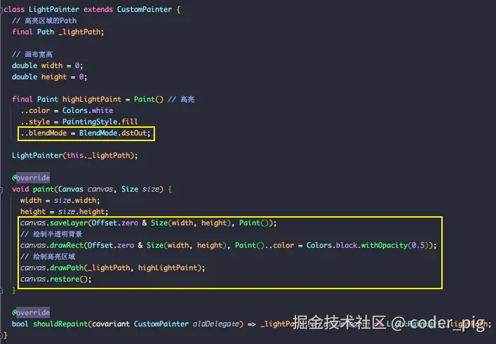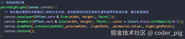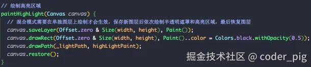 - ② 获取高亮组件的范围区域,配合「混合模式」中的 dstOut (目标图像和源图像重叠的区域变透明) 或 clear (将绘制区域变成透明) 模式来实现对应区域透明。