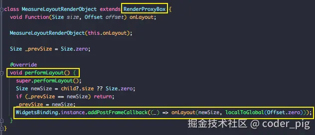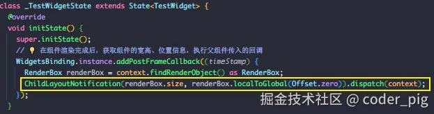 核心:在 performLayout() 中通过 WidgetsBinding.instance.addPostFrameCallback() 添加回调监听。