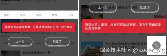 👻 它是 App 中一个很常见的组件,用于 帮助用户 快速熟悉和掌握App的使用方法 (首次使用 & 新功能) ,提高用户体验和操作效率。表现形式通常为这两者的组合: