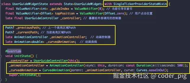 🤔 就是 从当前高亮区域 切换到 上/下一个高亮区域 的过渡效果,用到动画,State 混入 SingleTickerProviderStateMixin,定义两个属性保存切换前后的 Path,初始化 动画控制器 和 动画曲线。