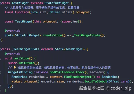 😀 然后,拿到 子Widget的尺寸和位置信息,一般都是需要向上传递给 父Widget 的,一种常见玩法 →「构造方法向下逐层传递回调」,具体代码示例: