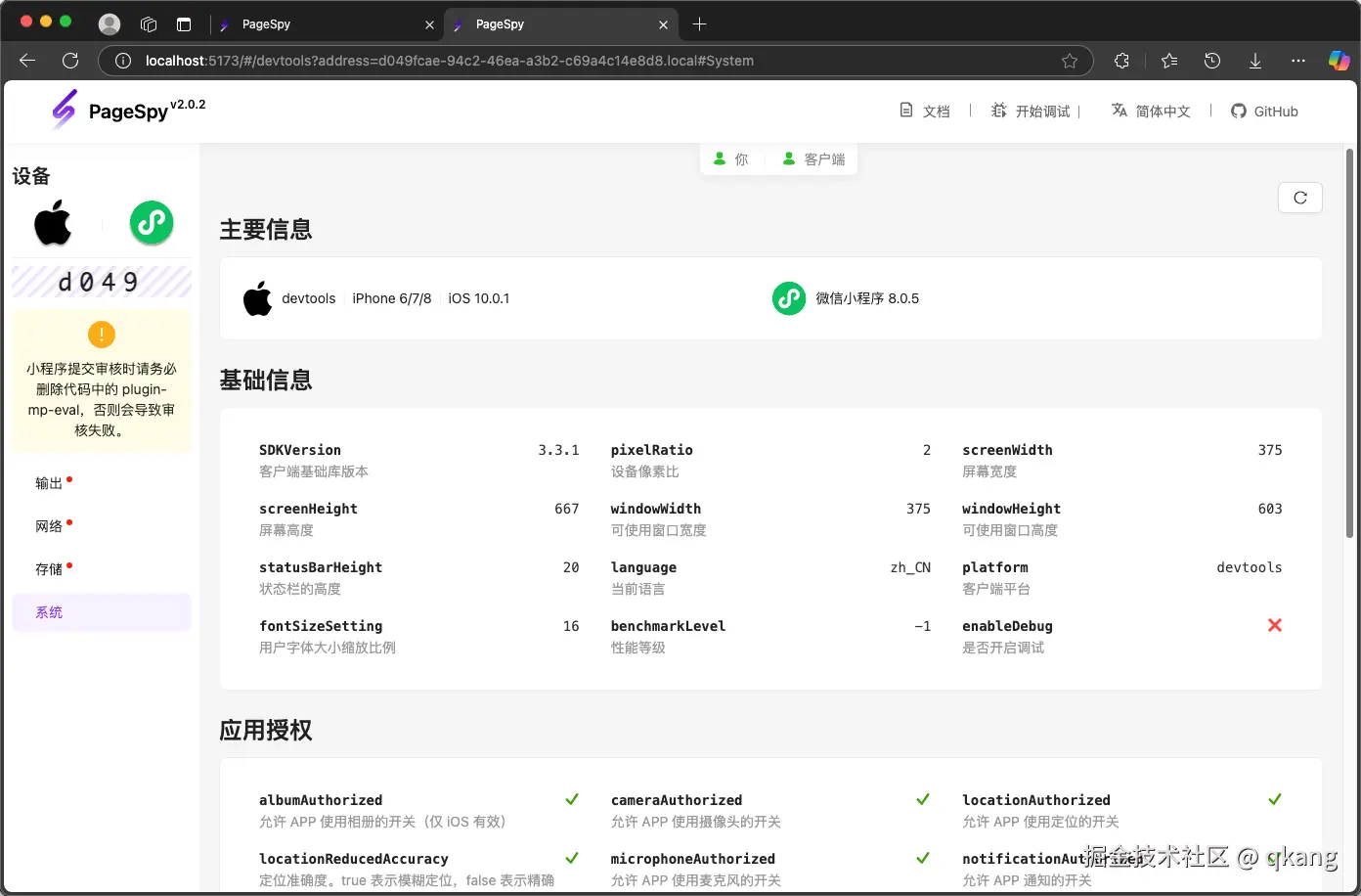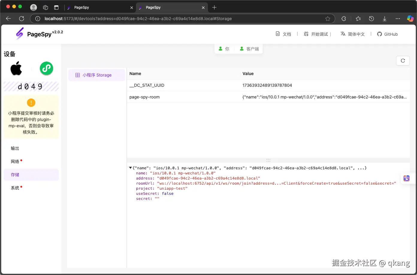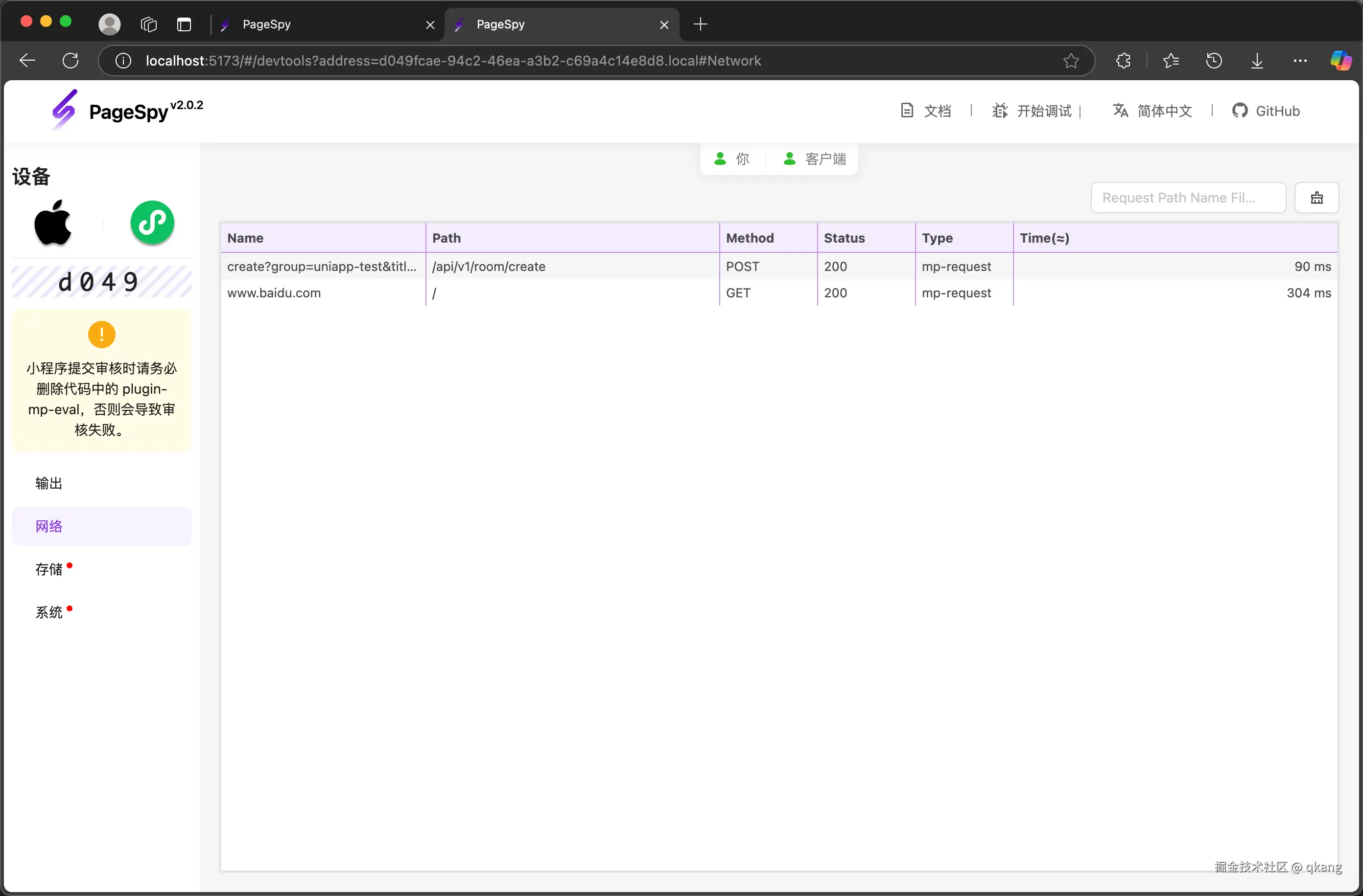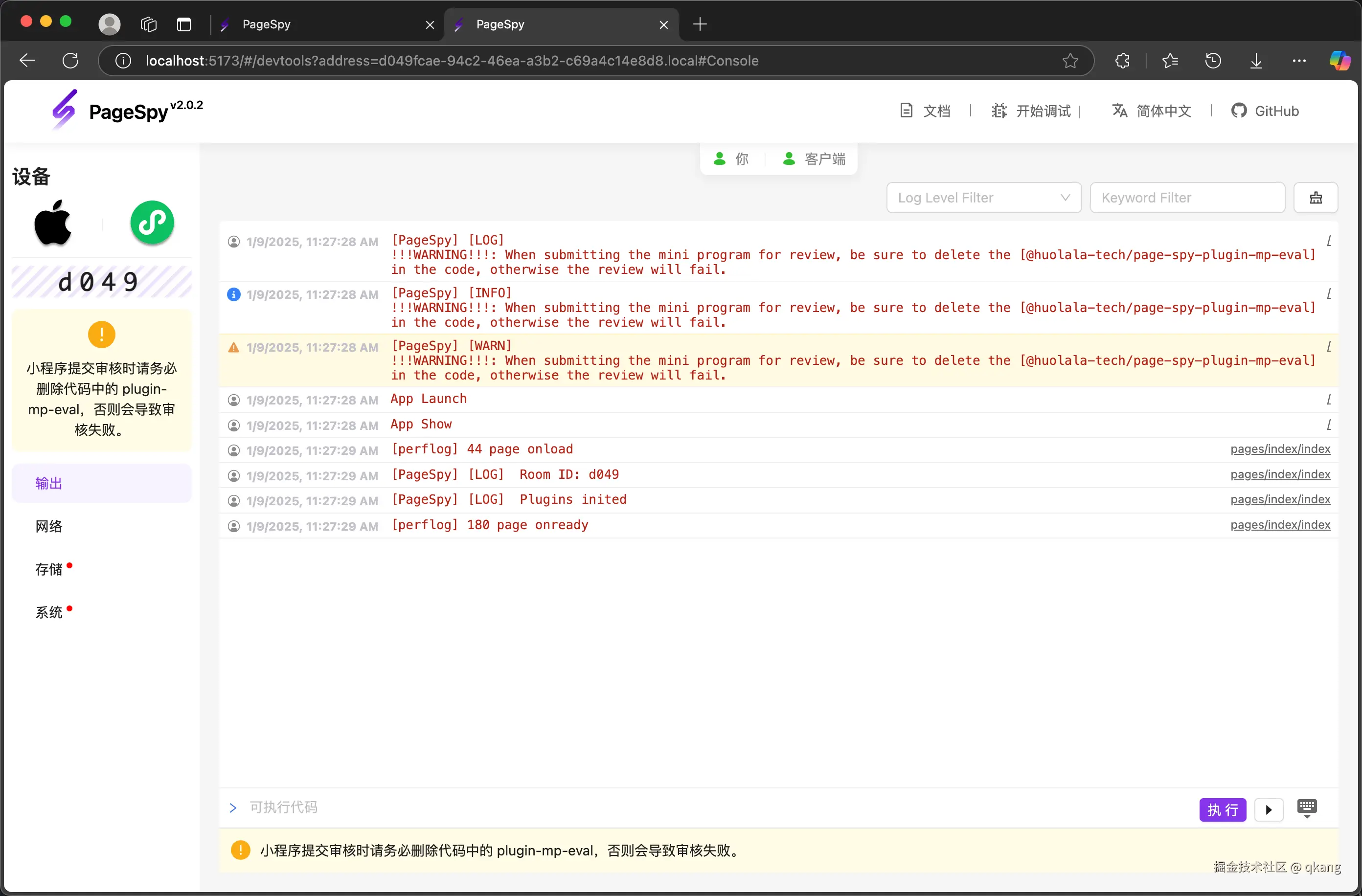 除了 web 平台,它还把同样的调试功能带到了小程序上。我们来看看使用 PageSpy 调试小程序有什么不一样的体验。