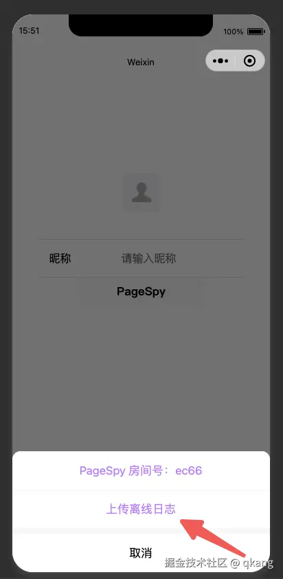 添加了该插件之后,小程序的一切日志就会被离线的记录在内存中,之后你可以在需要的时候,调用 $pageSpy.showPanel()方法呼出一个弹窗,就可以将刚刚记录的日志传到 PageSpy 后台: