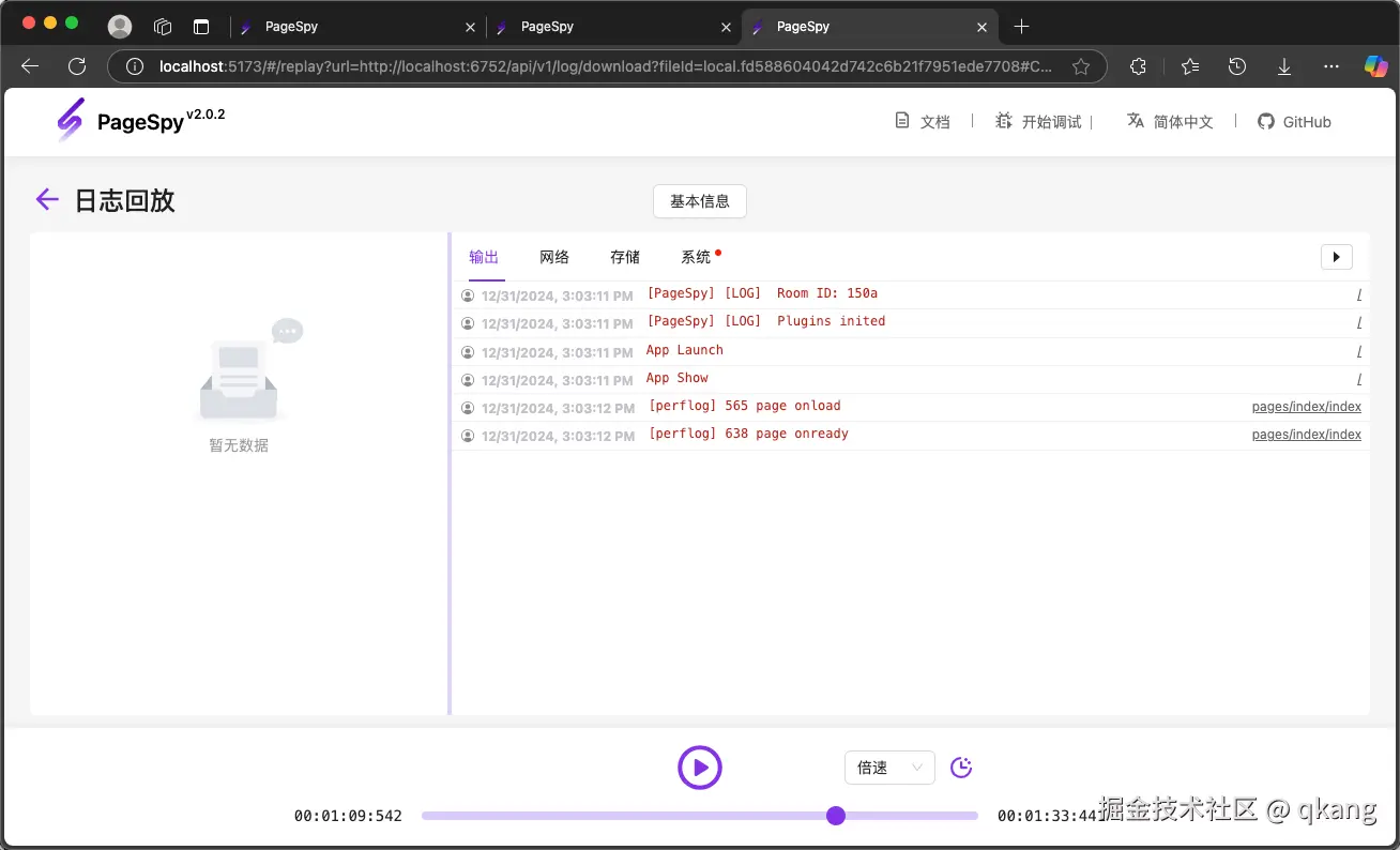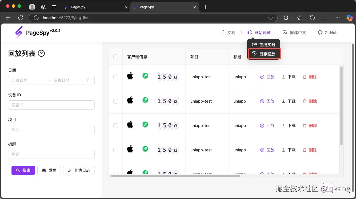 在 PageSpy 的调试端,进入「日志回放」页面,就可以看到刚刚上传的日志:
