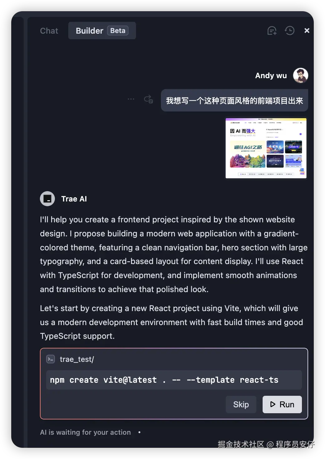 好了,接下来我们来试试 Trae 的重头戏功能 - Builder,它直接对标的就是 Cursor 的 Agent 功能,即都可以通过用户的提问直接生成一个完整的代码项目出来。