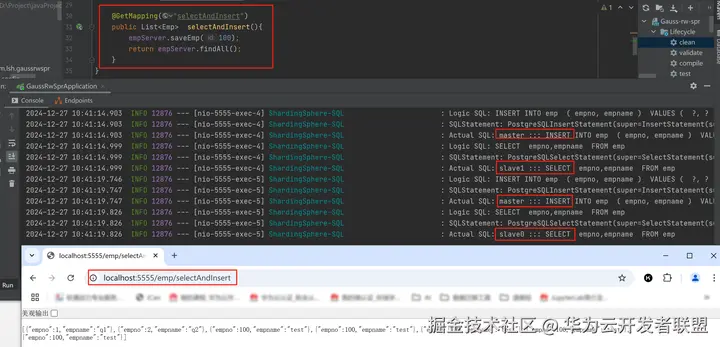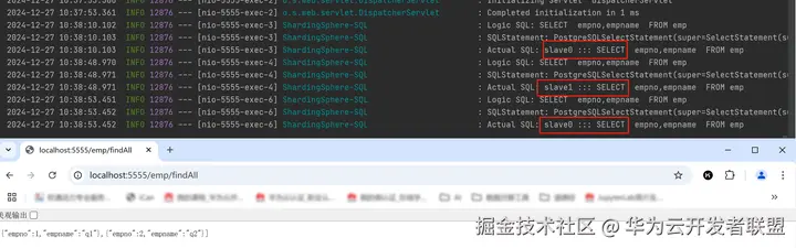 执行一个读写混合业务,但是没有事务控制,先插入数据再查询,在日志中可以看到插入数据在xxx.11(主节点)节点上执行,读取数据在xxx.182(slave0)或 xxx.152( slave1)上执行,实现了读写分离。