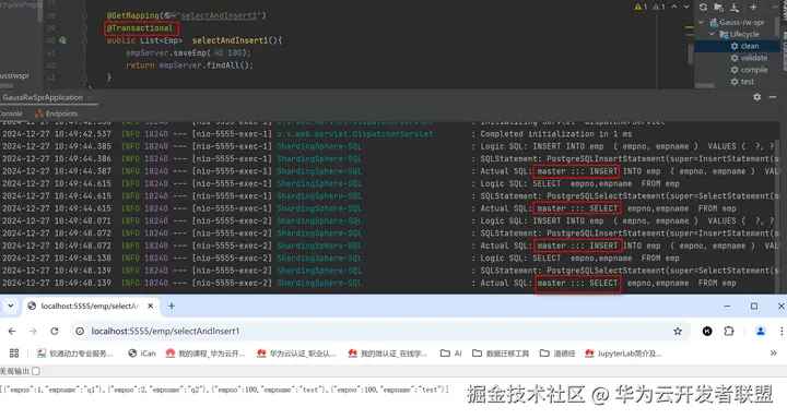 执行一个读写混合业务,但是整个业务有事务控制,先插入数据再查询,在日志中可以看到插入数据在xxx.11(主节点)节点上执行,读取数据在xxx.182(备节点)上执行,当一个事物中有读有写时,不进行读写分离。