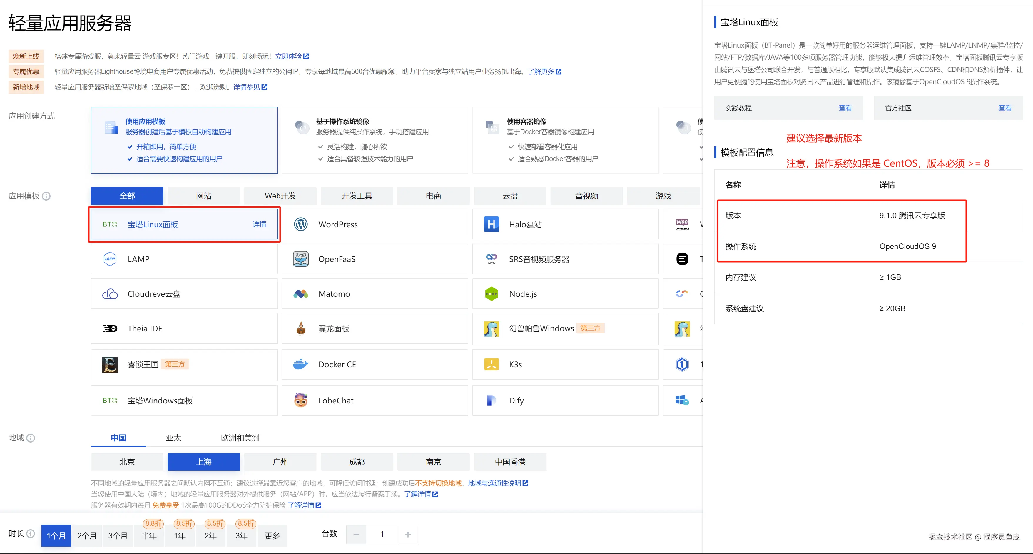 鱼皮这里选择一台预装了宝塔 Linux 应用的轻量应用服务器,配置为 2 核 2 G,部署咱们的项目足够了。应用模板一般选择最新版本就好了,如下图: