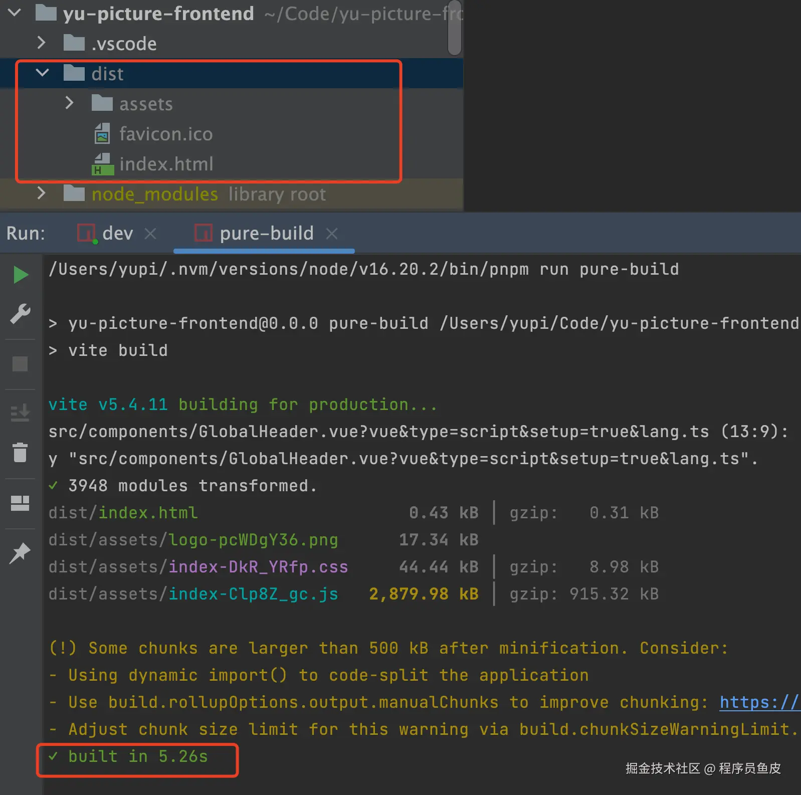 构建成功后,可以得到用于部署的静态文件 dist 目录: