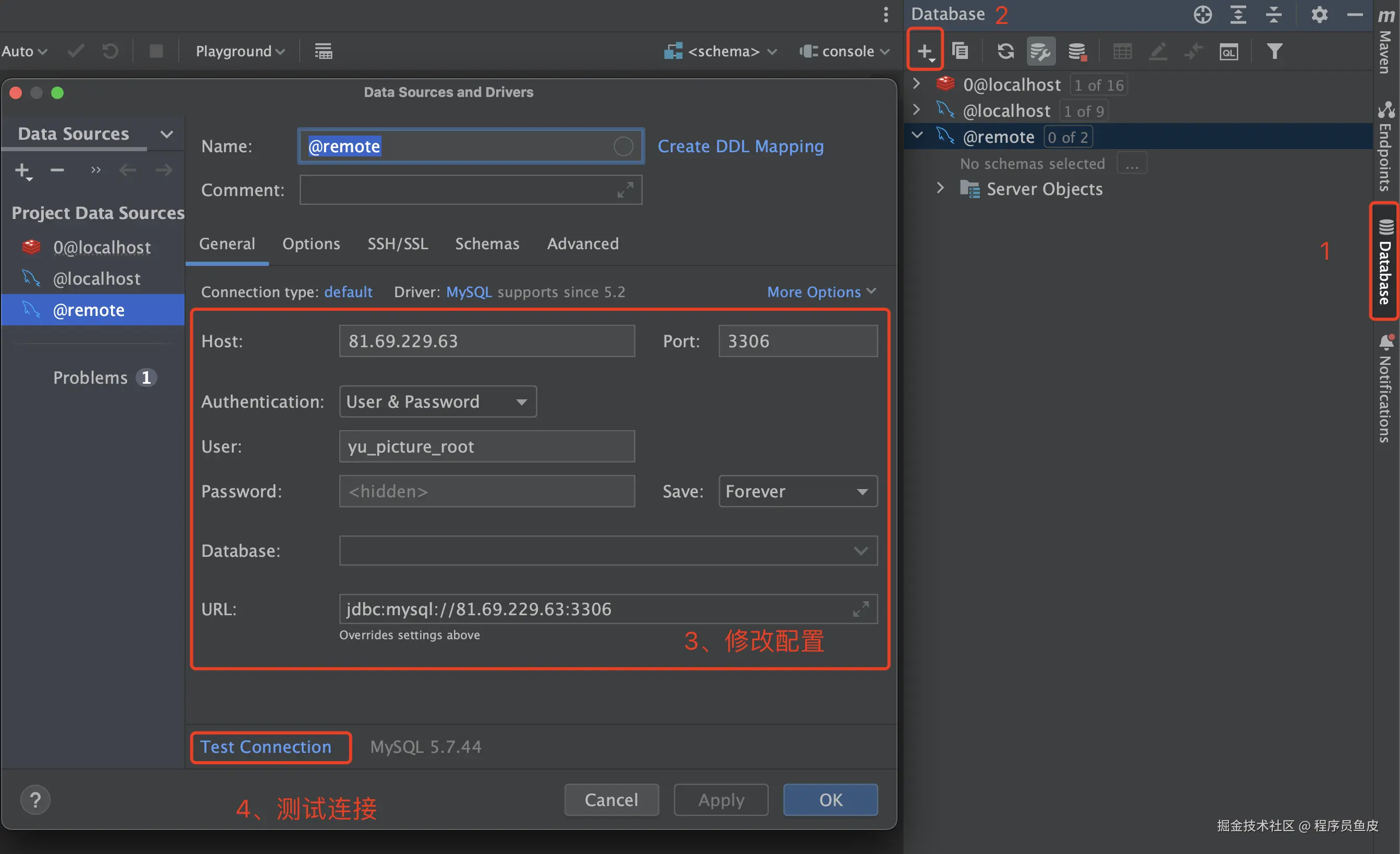 在 IDEA 中打开后端项目,通过数据库面板在本地检查连接是否正常: