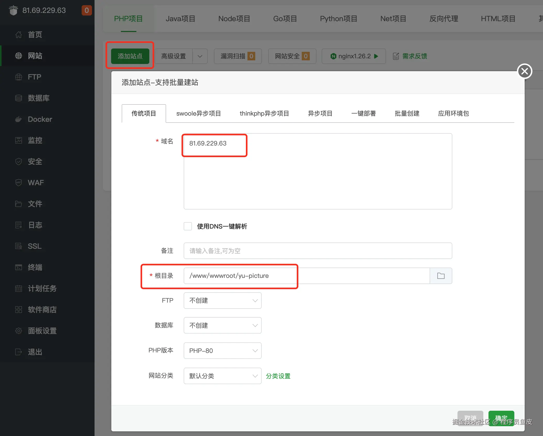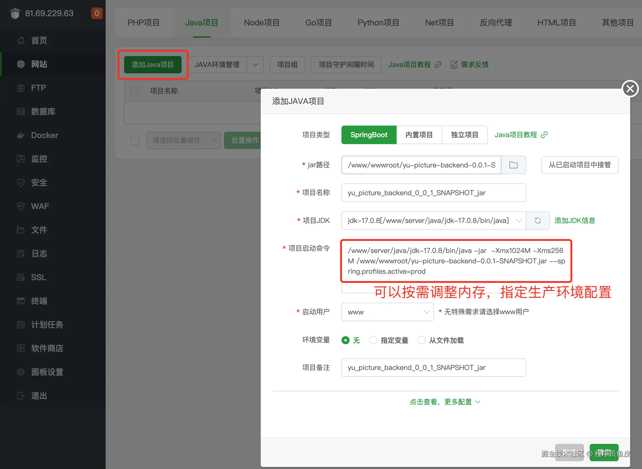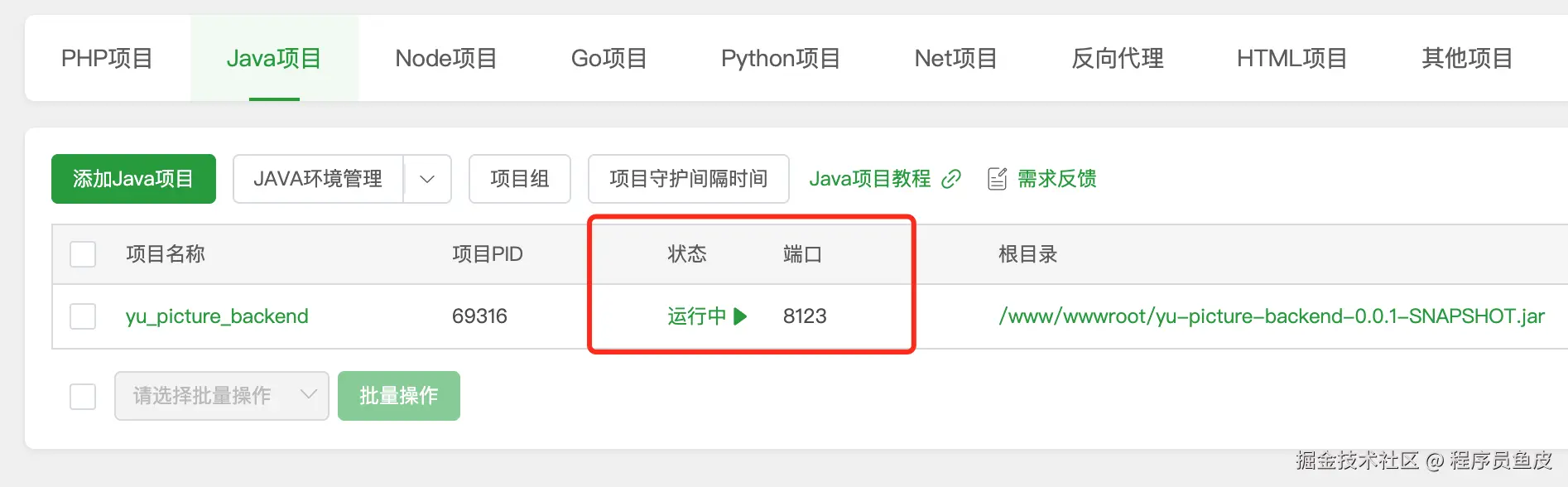涉及到具体的部署方式,前端要遵循 Vue 项目的部署模式,基于 Nginx 运行;后端可以直接利用宝塔的 Java 项目管理器运行 jar 包。