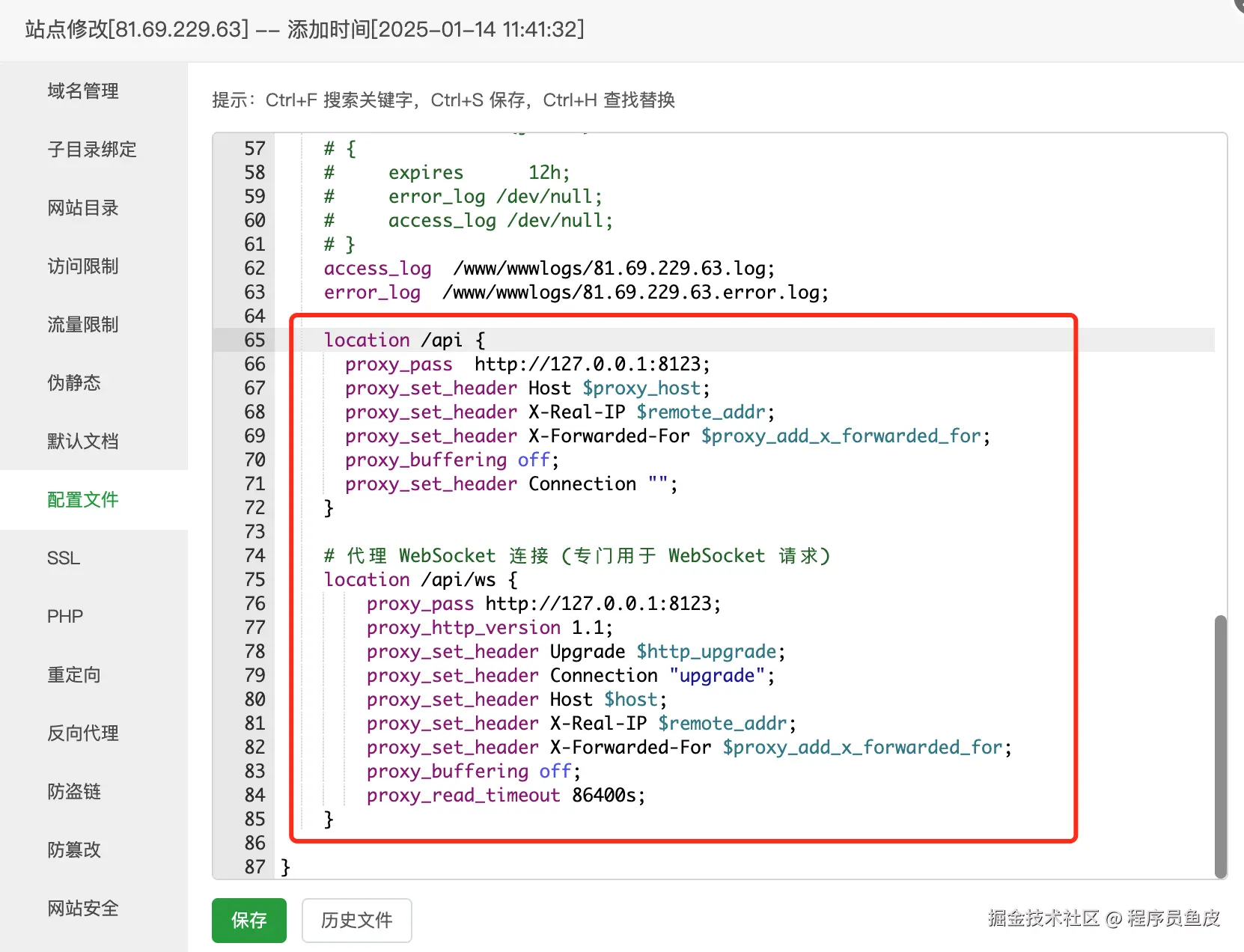 修改 Nginx 配置,补充下列代码: