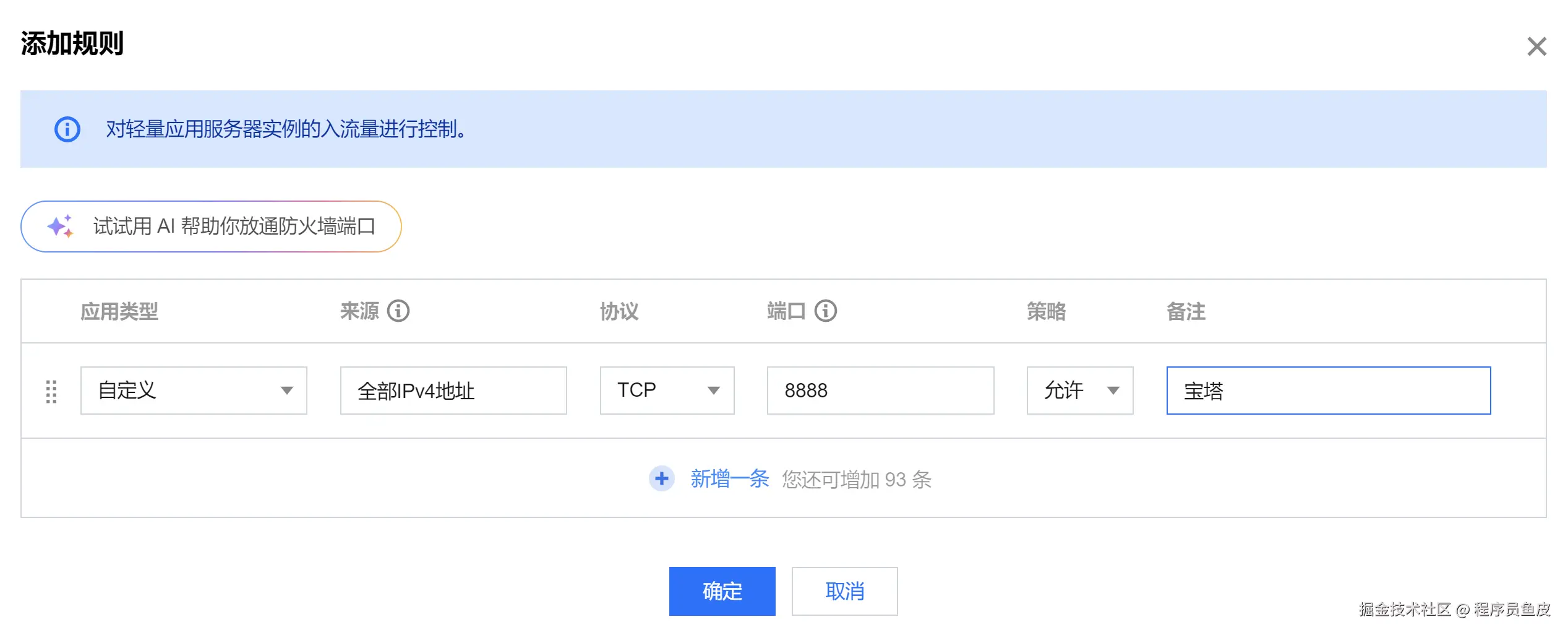 新版本的轻量应用服务器已经自动为我们放通该端口。否则需要手动新增一条防火墙规则: