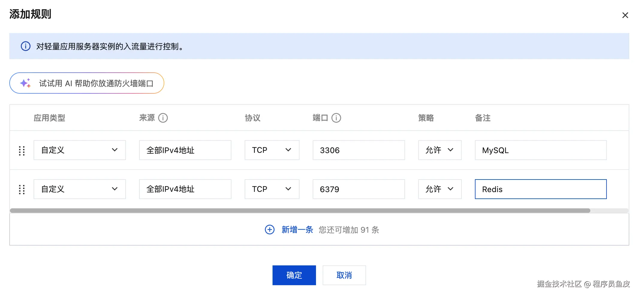 做好规划后,我们需要在腾讯云控制台的防火墙中开通需要外网访问的服务端口,比如 MySQL 和 Redis: