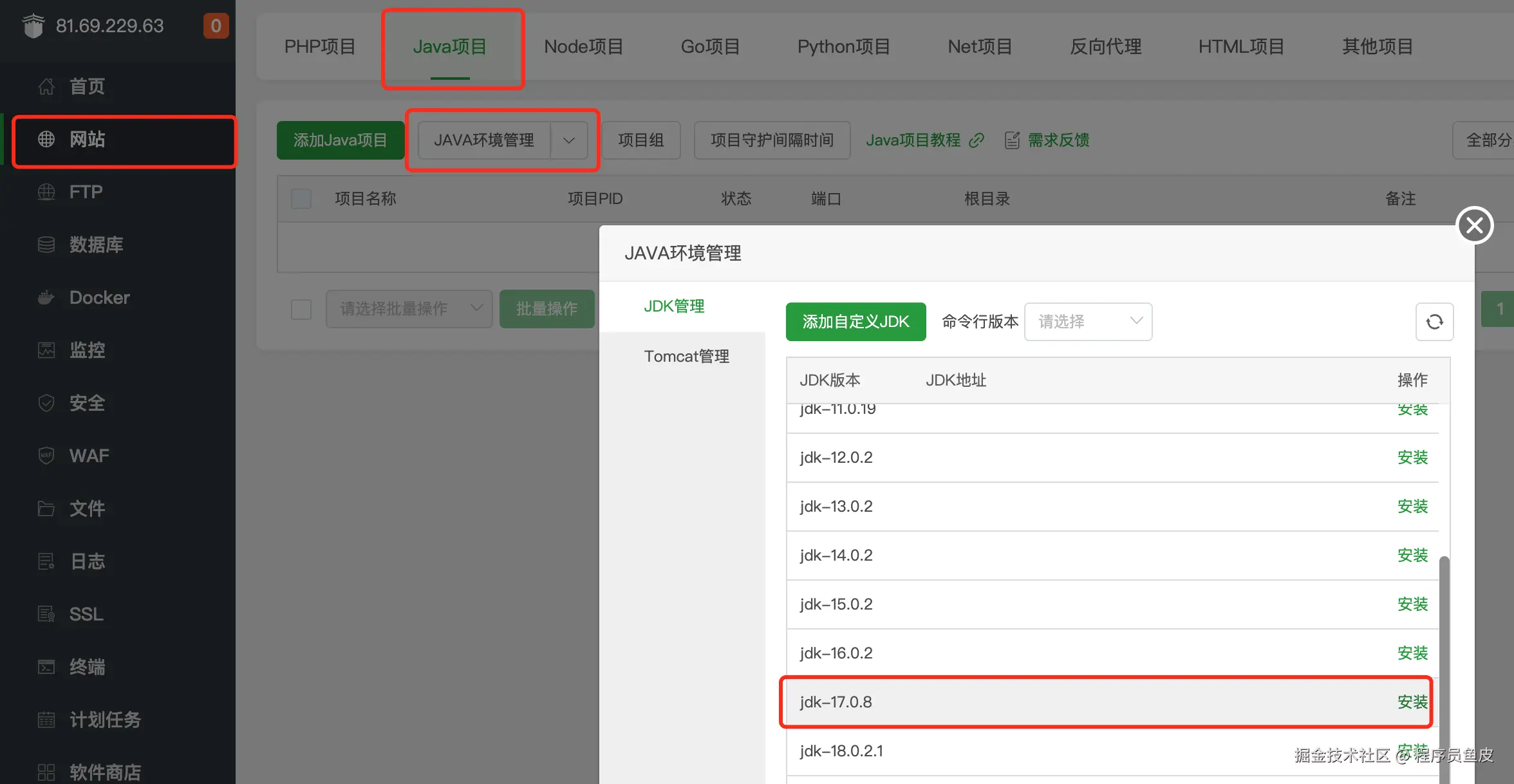 要部署 Java 项目,必须安装 JDK。在宝塔面板中,可以通过下图的方式快速安装指定版本的 JDK。此处我们先安装 JDK 17: