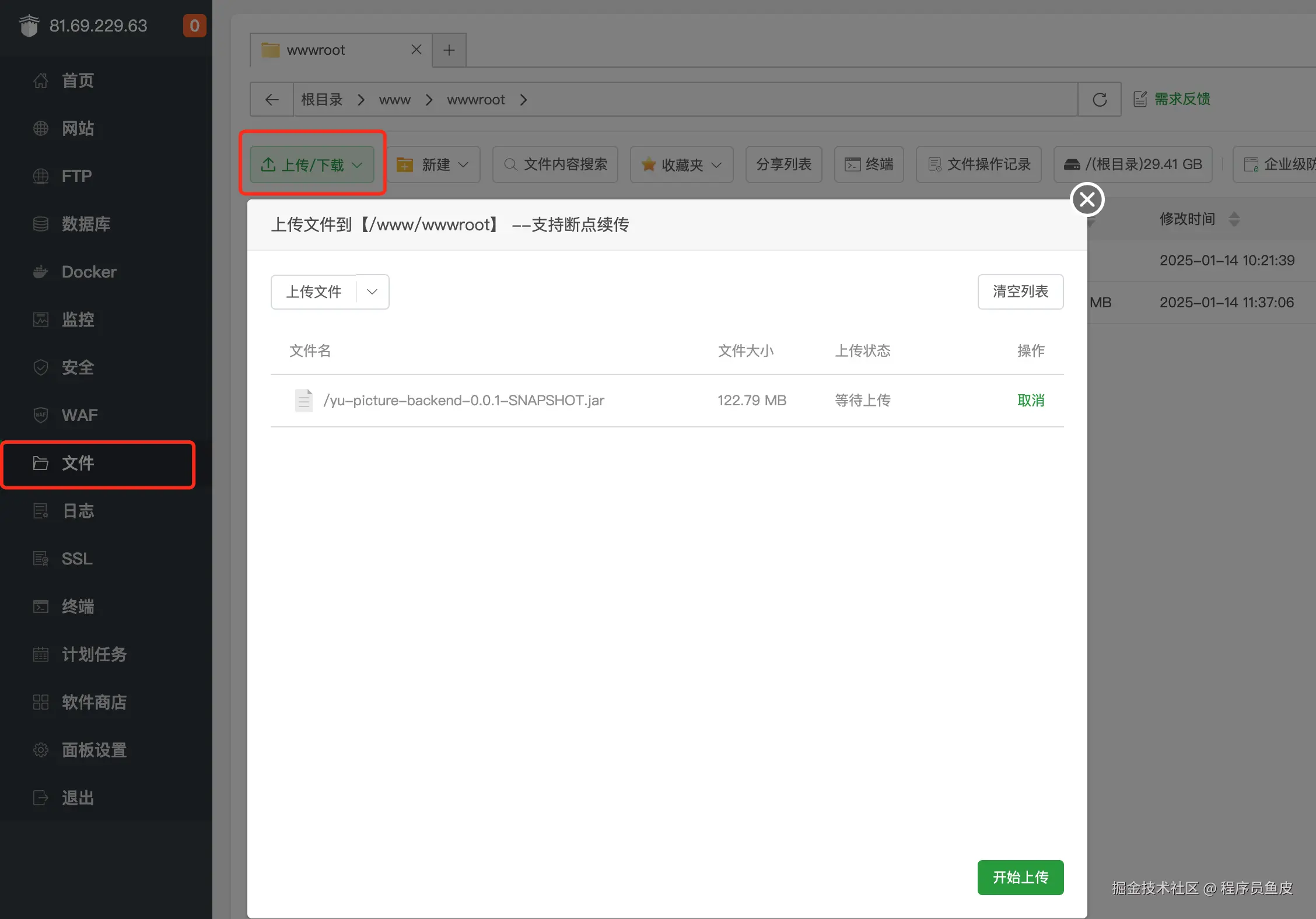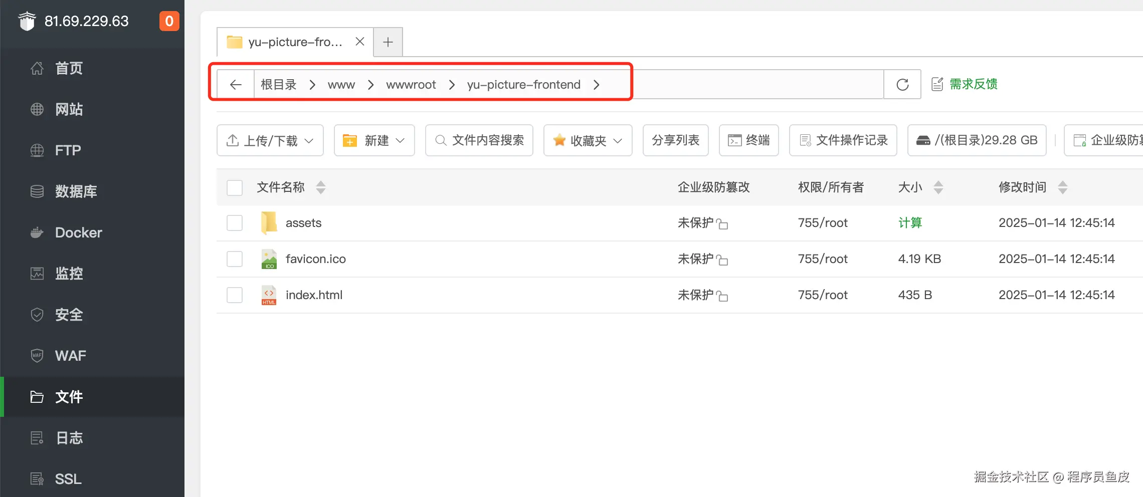 把 dist 目录下的所有文件上传到服务器上(可以新建一个 yu-picture-frontend 目录)。文件较多时,建议先在本地压缩,上传压缩包到服务器后再解压。如图: