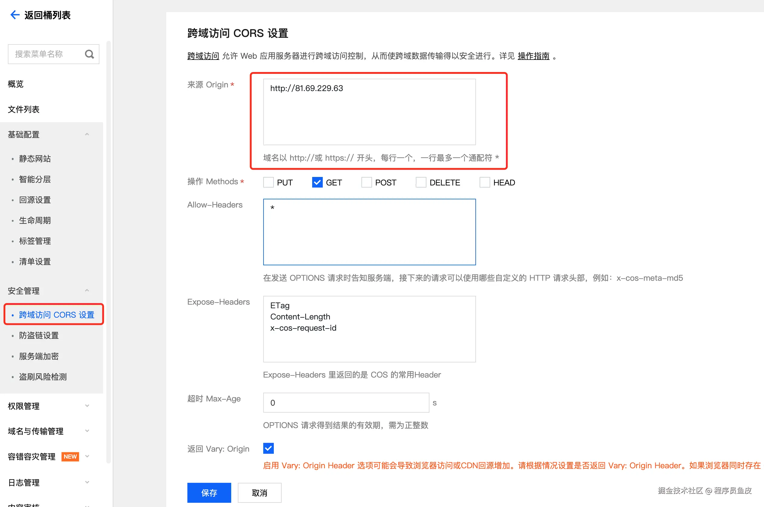 注意,要给对象存储增加该服务器 IP(或者实际访问前端域名)的跨域配置,否则编辑图片时将无法正确加载图片。