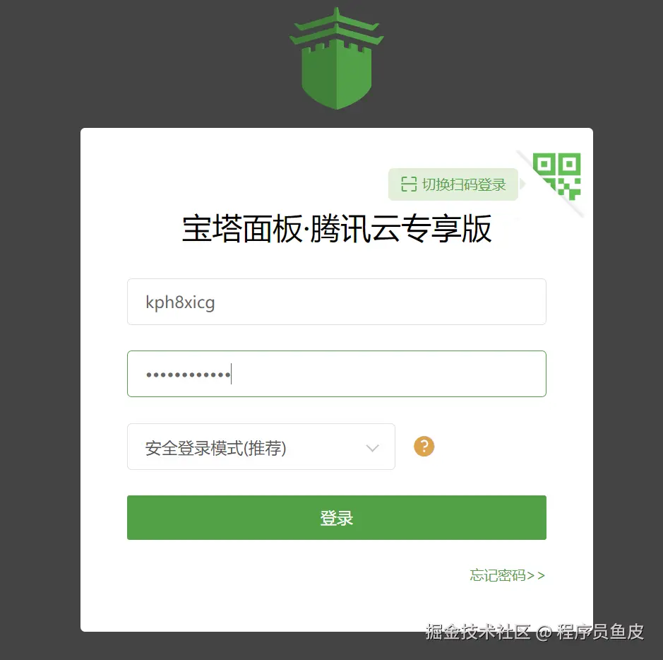 根据终端输出的信息,访问宝塔面板,输入初始用户名和密码: