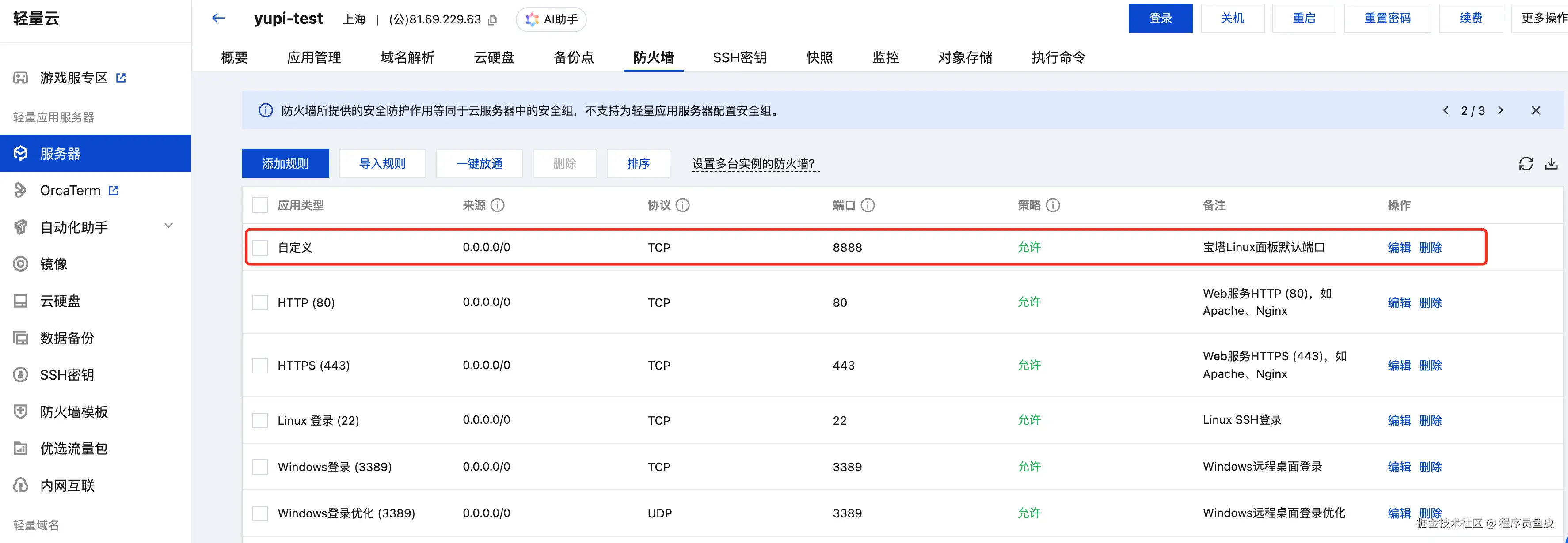 点击服务器进入详情页,在防火墙标签页中放通 8888 宝塔面板端口,否则无法在自己的电脑上访问宝塔。