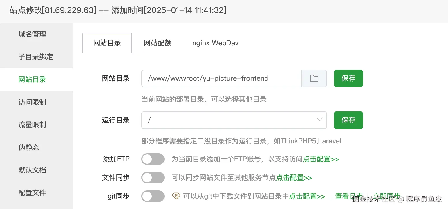 修改已有站点的网站目录配置,指向前端文件根目录: