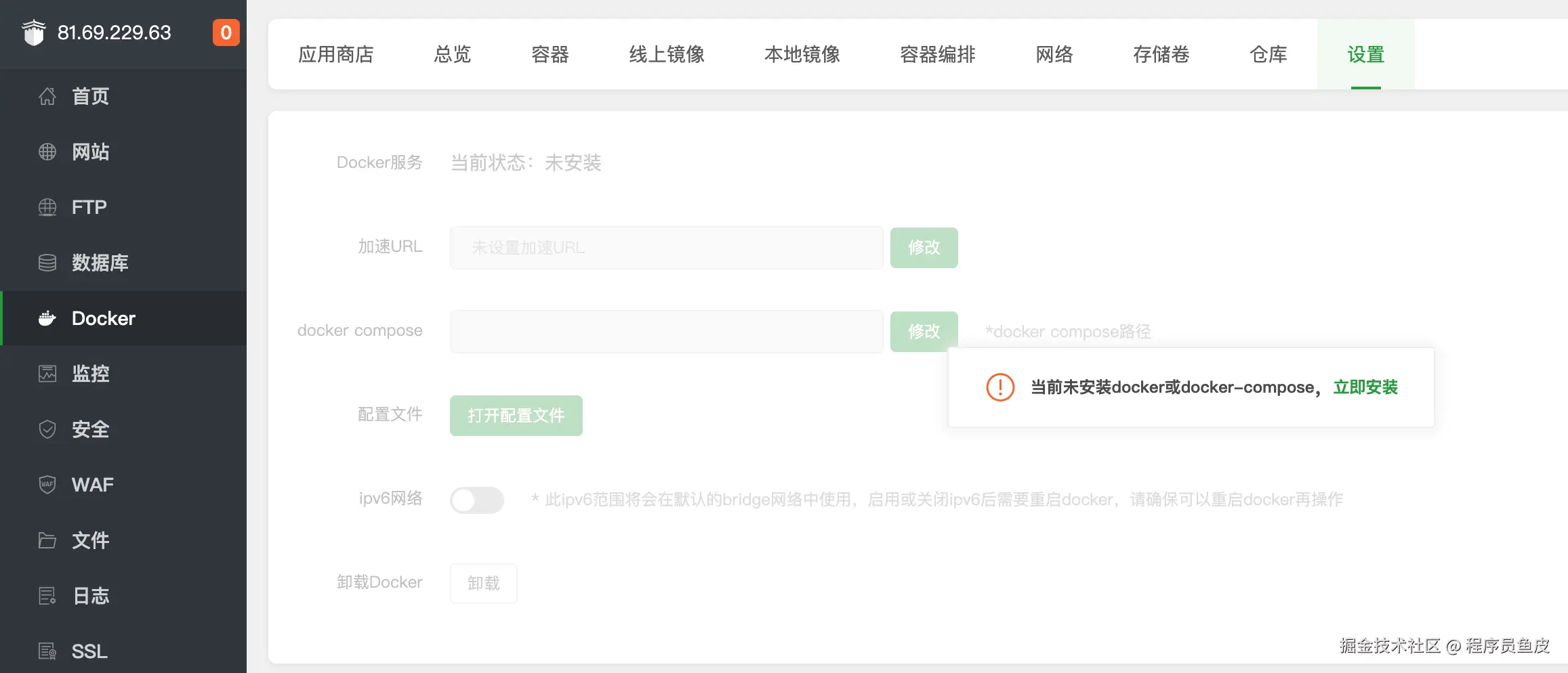 有了配置文件后,就可以利用宝塔面板自带的 Docker 能力,去进行项目的部署了,感兴趣的同学可以尝试一下: