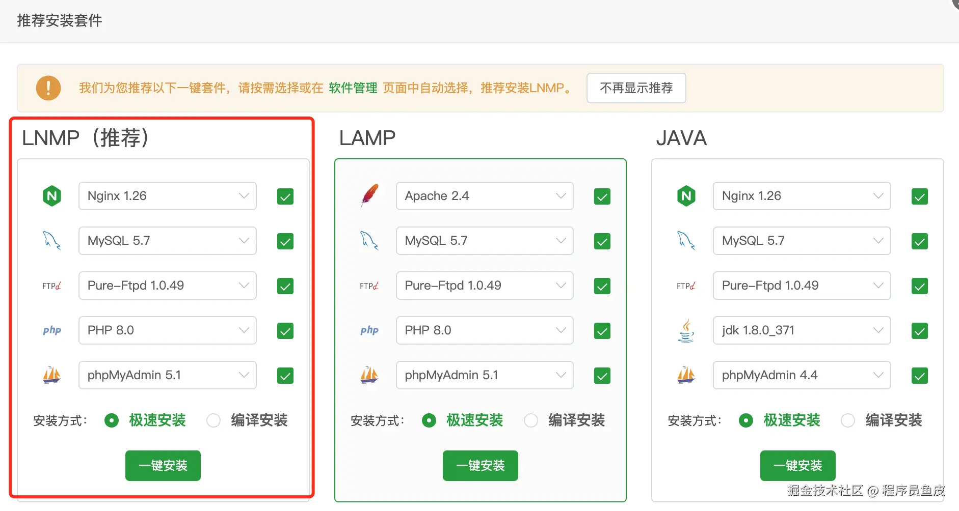首次进入宝塔时,会提示我们安装环境,这里推荐安装 LNMP(包含 Nginx 服务器),适合部署前后端分离的项目: