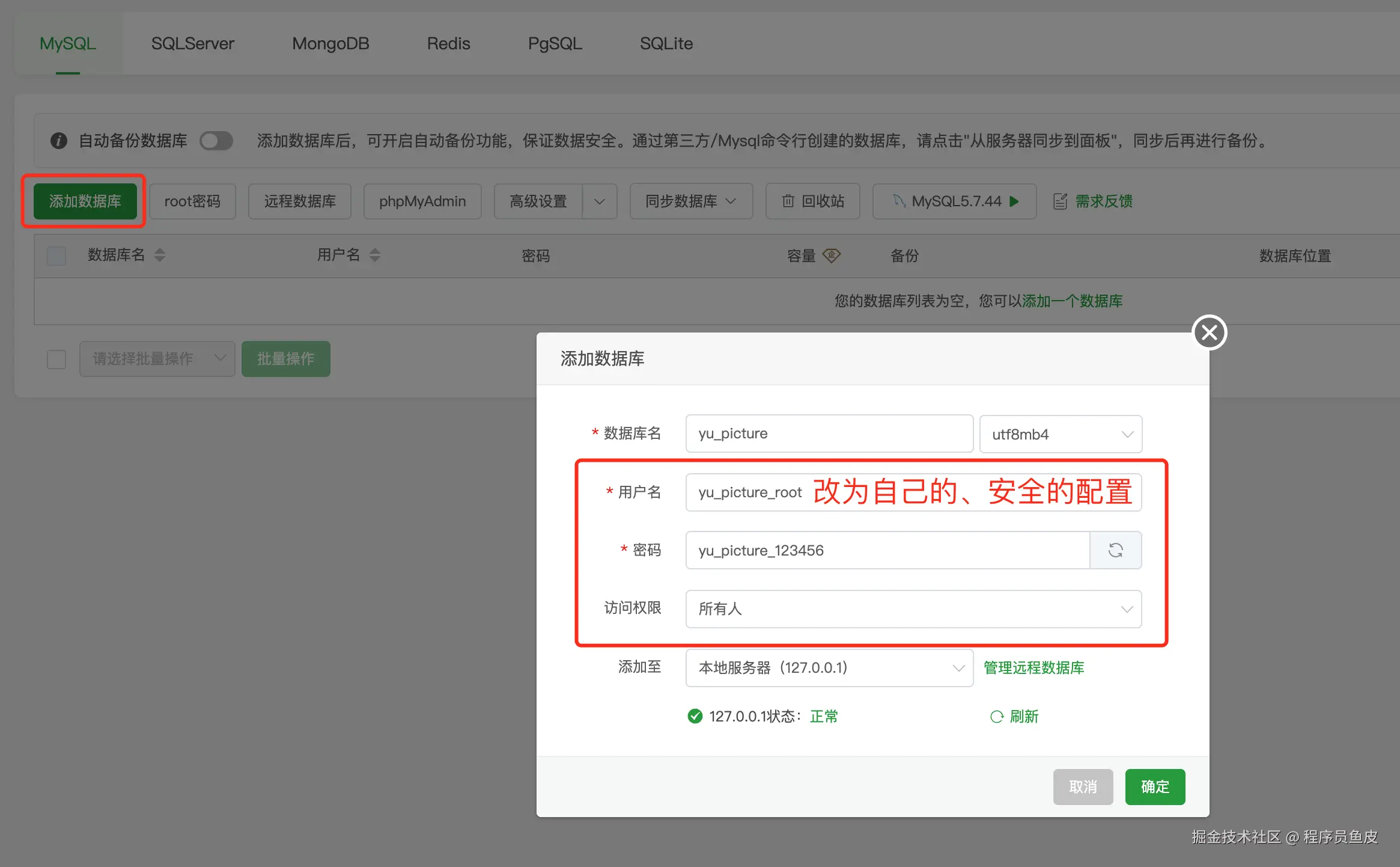 先为后端项目添加一个数据库。数据库名称和我们项目需要的数据库名称保持一致(此处为 mianshiya),注意用户名、密码和访问权限: