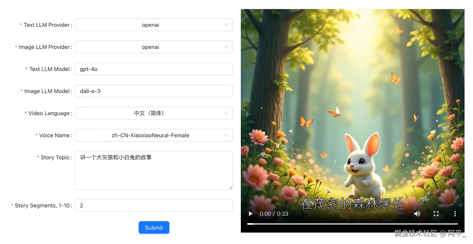 借助 AI 大模型,只需要输入一句话,就可以生成一个故事短视频,生成的视频截图如下图。具体的视频效果可以去 github 的项目主页体验。