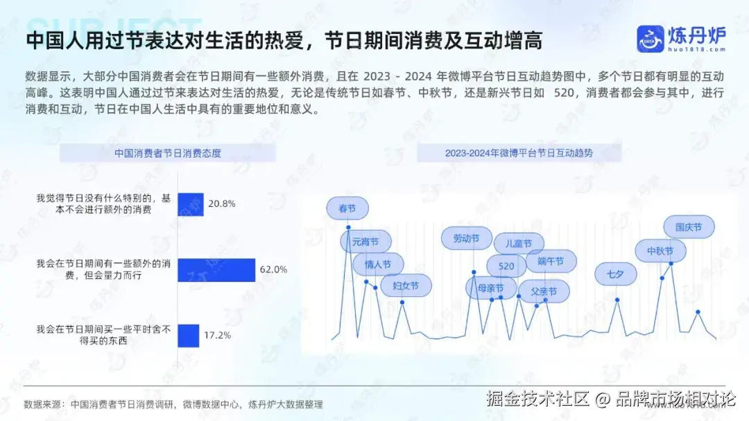 中国人通过过节来表达对生活的热爱,在节日期间,无论是传统节日如春节、中秋节,还是新兴节日如520,消费者都会积极参与其中。数据显示,微博平台上的节日互动趋势图中,多个节日都有明显的互动高峰,表明节日期间的消费和社交互动显著增加。