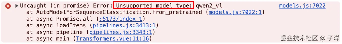并非所有模型都支持 Transformers.js。当尝试使用不支持的模型时,会报错。