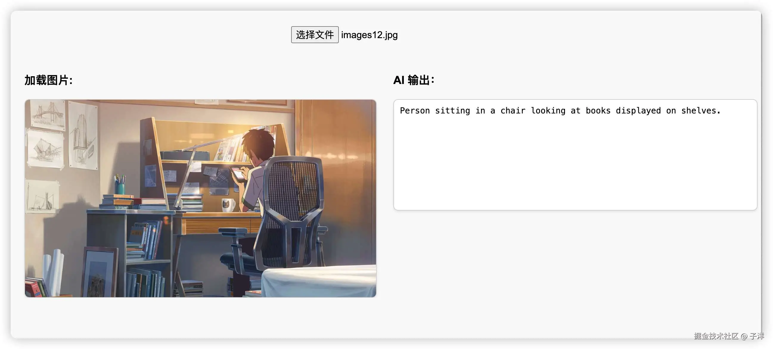 使用 Mozilla/distilvit 模型进行图像到文本的生成。该模型的推理速度较快,但生成效果一般。