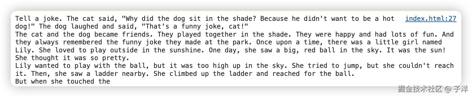 以下代码使用了 Xenova/llama2.c-stories15M 模型进行文本生成。该模型的推理速度较快,生成的文本质量也较好。