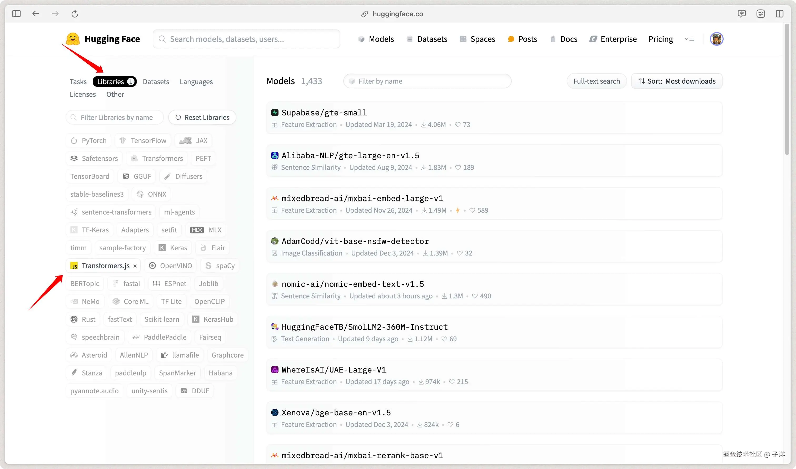 可以在 Hugging Face 官网的 Libraries 中筛选 Transformers.js,查看支持的模型列表。