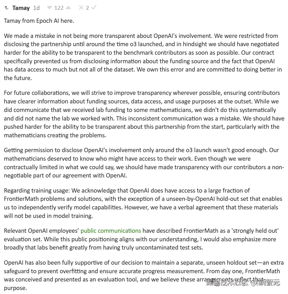 总结来看,Epoch AI 的确意识到了这次事件的严重性,但是很多回应依然停留在「公关套词」层面,并且全程都在甩锅称自己不说是因为「合同」的限制。