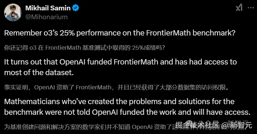 【新智元导读】 又爆大瓜!FrontierMath 的 o3 惊人表现,竟是因 OpenAI 资助了 Epoch AI 而提前获得大部分试题访问权。OpenAI 模型的性能究竟几分是真,几分炒作,愈来愈变得扑朔迷离。