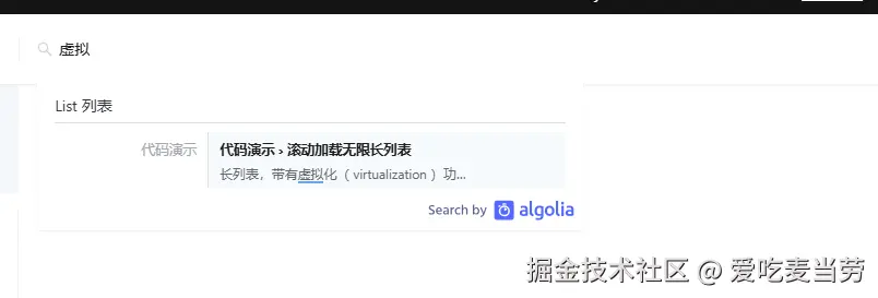 比方说,在ant-deisgn文档中,我想找一下关于虚拟滚动技术在哪些组件中有使用。我们在官方文档上搜索,结果就是这样的(见下图),结果有点不尽人意